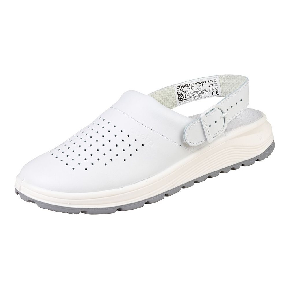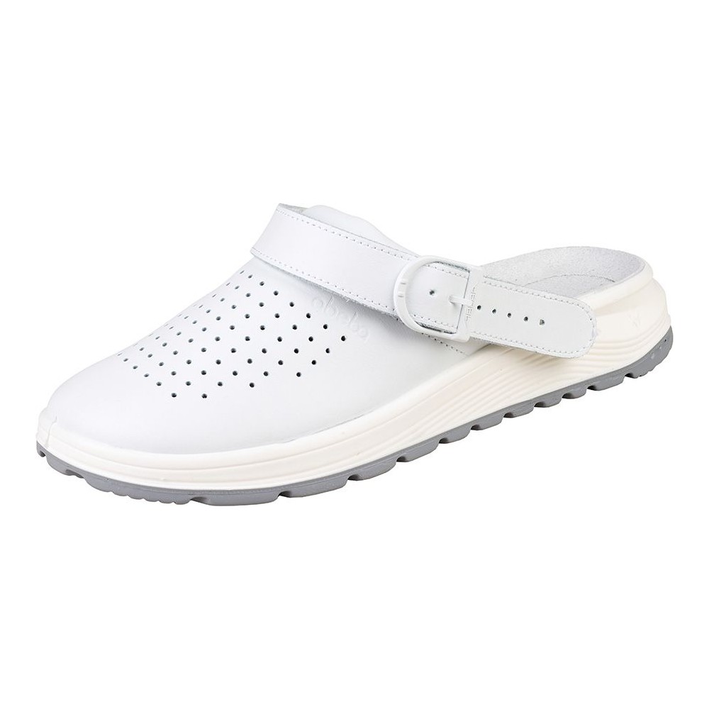 Pantolette ABEBA en cuir fleur, empeigne perforée, bord du cou-de-pied rembourré, support plantaire orthopédique en cuir, talonnière réglable pouvant être pivotée sur le cou-de-pied, semelle d’usure antidérapante.